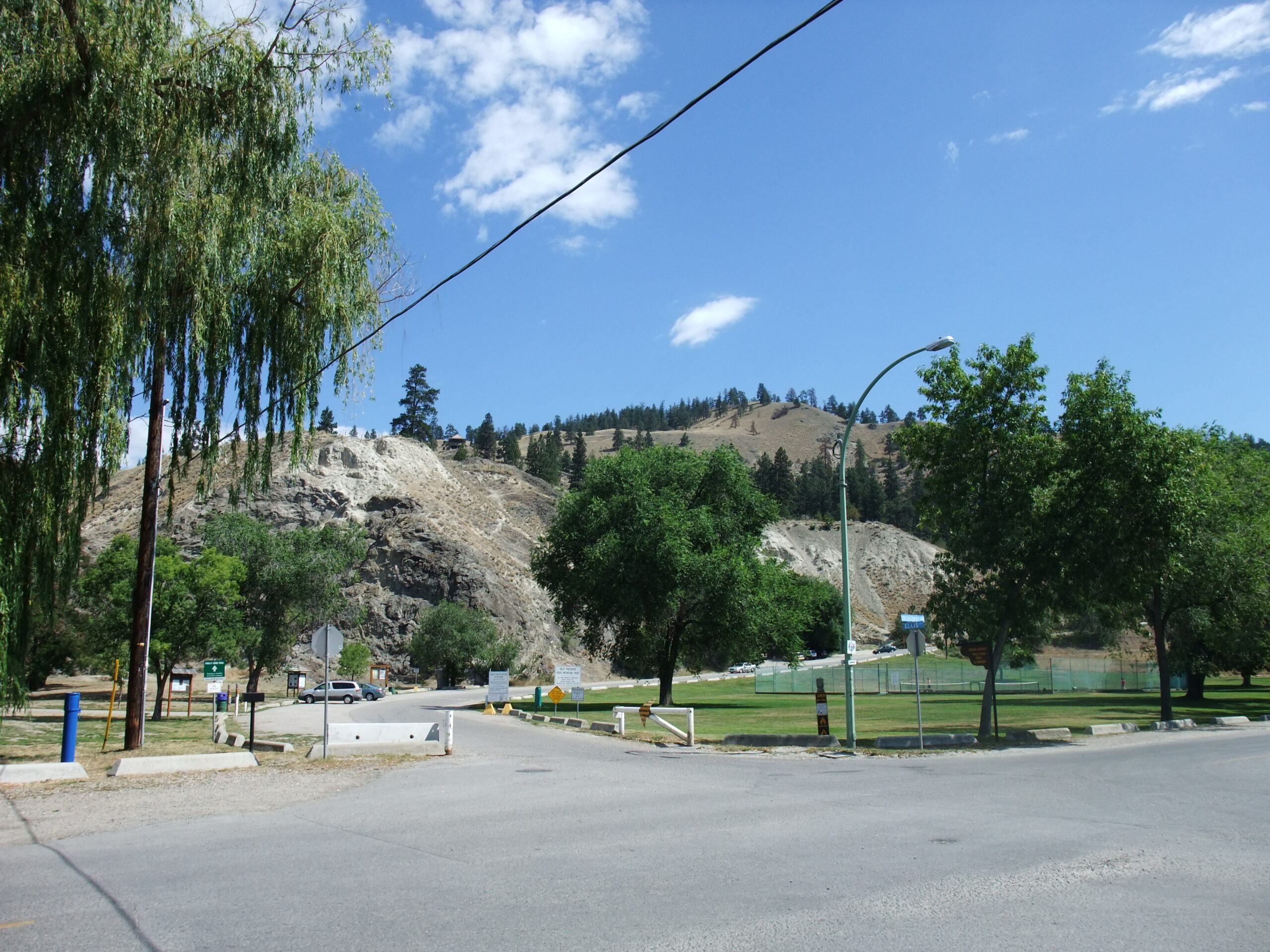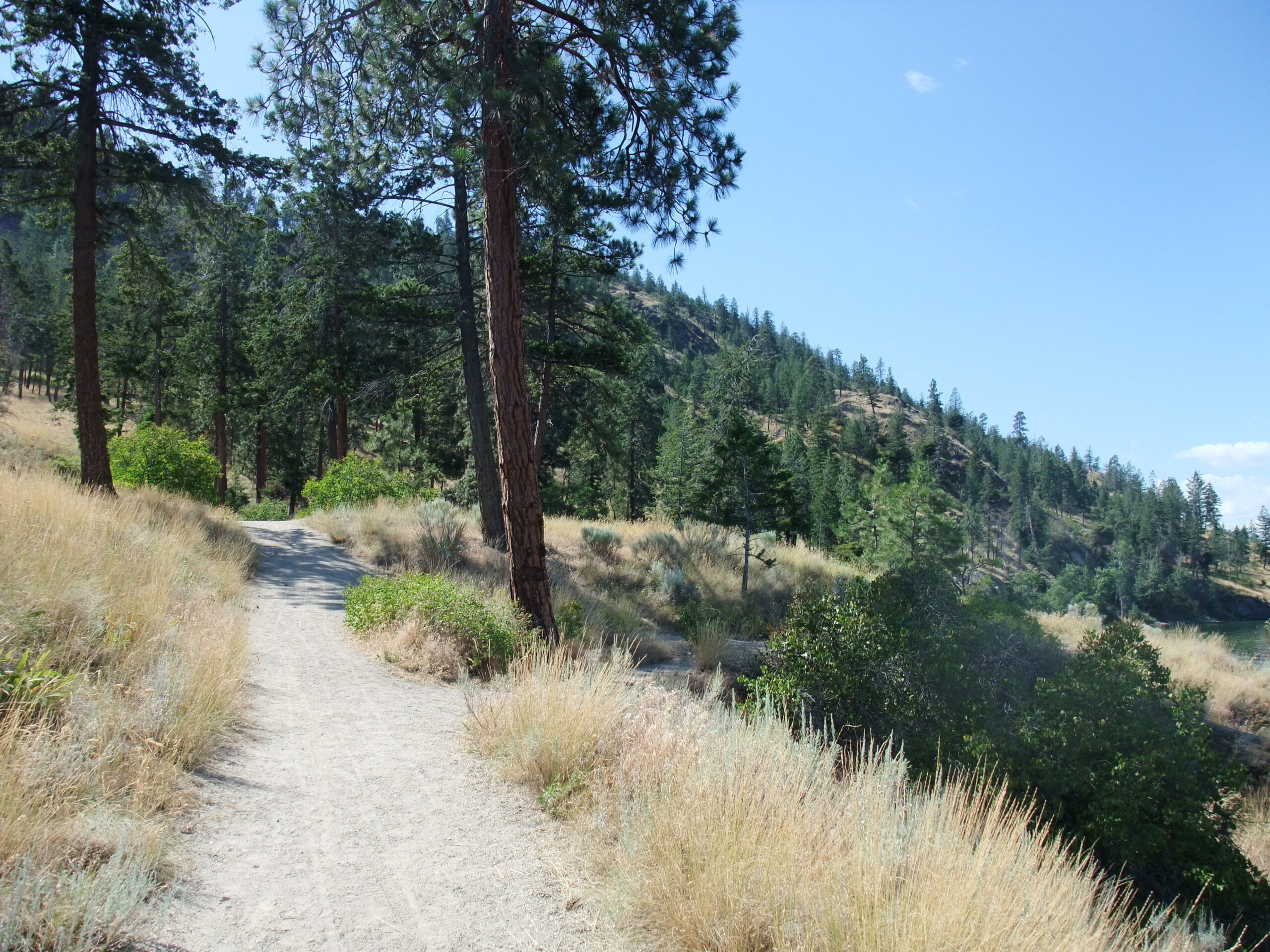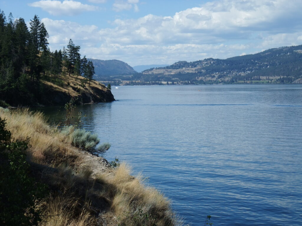 The next day, I rented a bike from the bike rental shop around the corner (about a 15-minute walk) and set off for my mission „Knox Mountain“. The ride to the park entrance was no problem, even though it was already quite warm. As always at the foot of a mountain, there was work to be done: pedaling uphill…. I was able to use the road to get to the first parking lot and viewpoint, then I switched to a trail (once again in bear country), but it seemed to be designed more for going down than up, so after 10 minutes I rode back the way I came. The next attempt wasn’t really successful either, so after a snack break at Bob’s Grave (whatever that is, because I didn’t see a grave anywhere near), I made my way back.