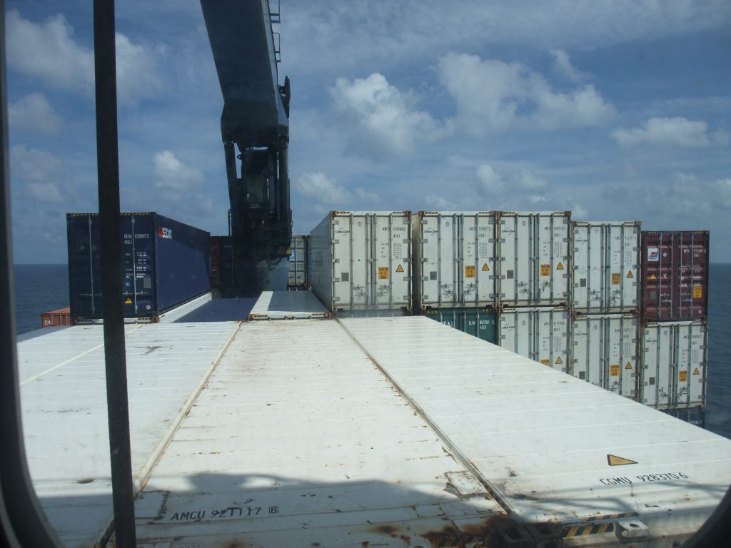 At around 8:30 a.m., we finally set off (way too early for me) for the port. Mr. Hardy from CMA CGM said we should call him before driving into the port area, but Nsenga said it would be fine, and when we tried to call this morning, no one answered. Anyway, we ended up standing in front of the security gate and weren’t allowed in. I have no idea what Nsenga, the security guy, and Mr. Hardy discussed, but the fact was that we would have had to drive back to CMA to get a permit to enter the port area, and it was too late for that (because of Nsenga’s bank appointment). So they ordered a taxi to take me to the ship (about 500 m), then Nsenga sped off and I stood around in the cold wind at the security entrance… until a taxi picked me up about 20 minutes later.
