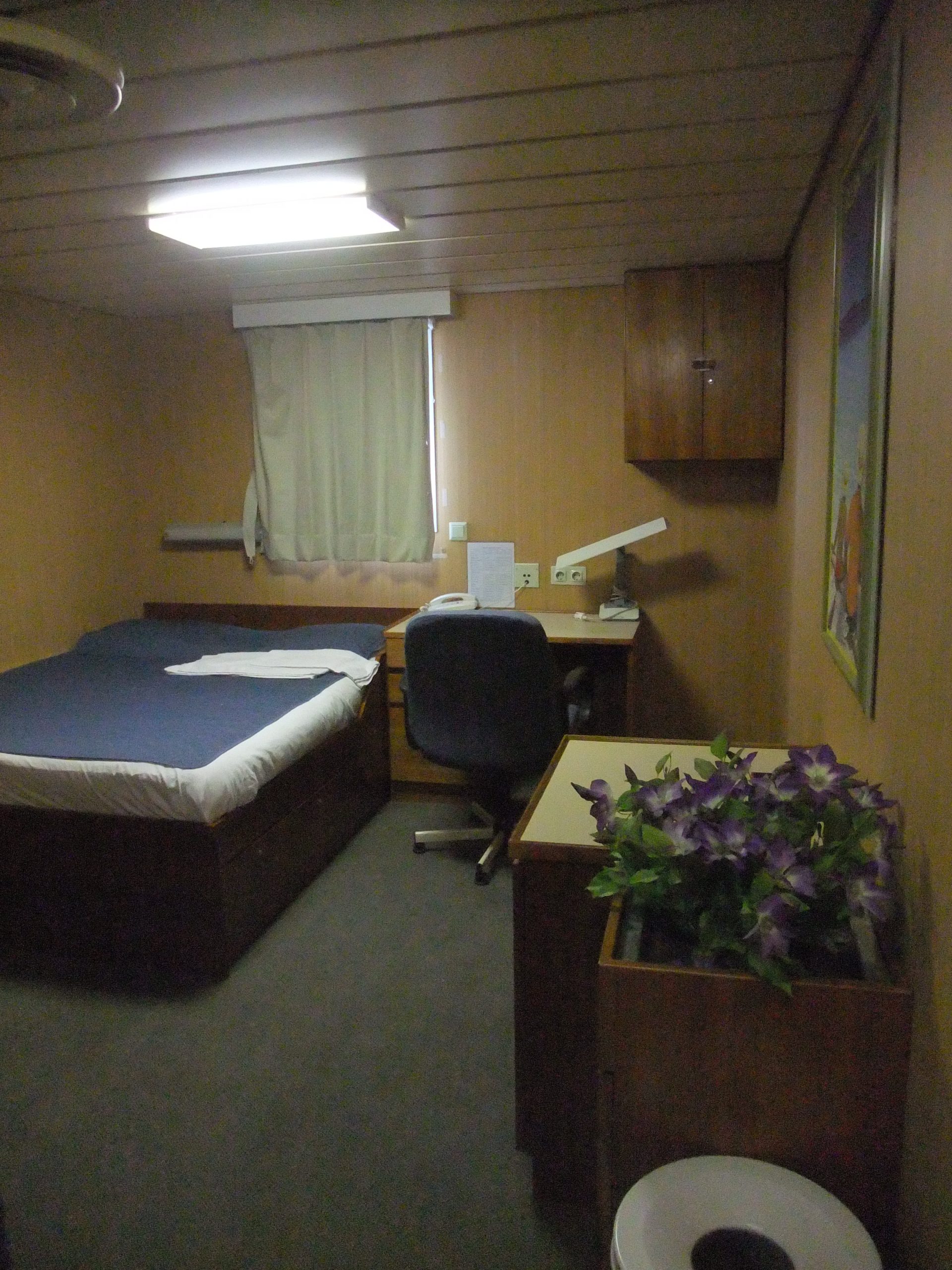 She then showed me my cabin, the pool, and the mess hall, where the head waiter asked me if I would prefer to eat alone or with the cadets. So it’s clear: I’m the only passenger on board—congratulations!