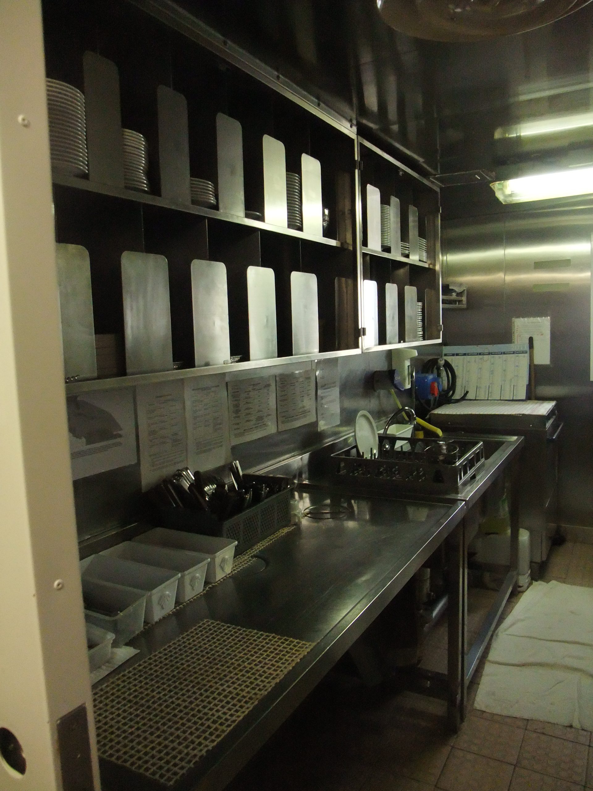 After a brief involuntary contrast shower (the water comes out warm for about half a minute, then a little lukewarm, then cold, and then warm again), I went down to the mess hall, where only the captain and the chief engineer were still sitting. They had probably worked through the night and were now off duty. Of course, the boys were all gone, only the used plates and breadcrumbs were left on the table. The head waiter (I really should ask for his name again) said that it was no problem, there was still plenty of everything left. So I digged in: baguette with apricot jam, baguette with strawberry jam, baguette with even more strawberry jam, accompanied by real French Russian Chinese tea, which, according to the description on the tea bag, was something like chai. In any case with very nice cloth tea bags, and it was actually delicious, although I felt that something was missing. Maybe cream and cinnamon….???